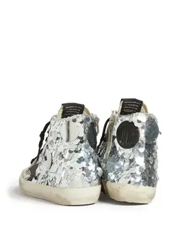Отделка серебристыми пайетками, кожаный язычок, высокий верх, шнуровка
