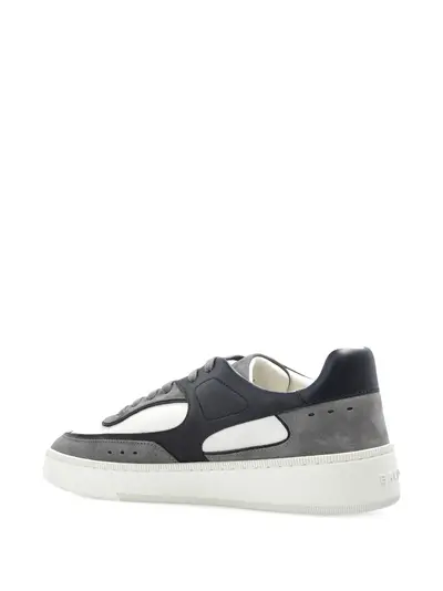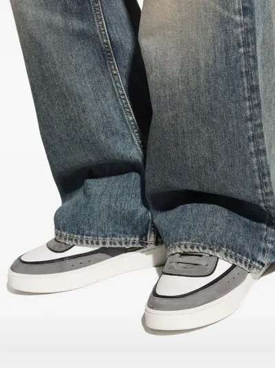 Кожаные вставки серо-белого и темно-серого цветов, шнуровка, плоская резиновая подошва, круглый носок
