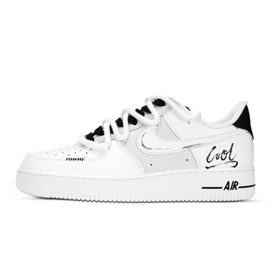Эти кастомные кроссовки изготовлены на основе модели Nike Air Force 1, артикул CW2288-111, с дополнительными артикулами (DD8959-100, DH2920-111). Эти классические кроссовки удобные, прочные, дышащие и нескользящие. Они украшены ручной росписью с английской надписью «COOL», что делает их простыми и стильными. Классическая белая расцветка дополнена черным, а дизайн вдохновлен черно-белыми надписями. В комплект входит защитный щиток для обуви.