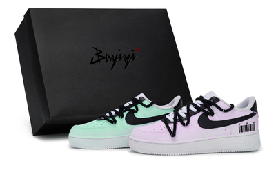 Эти кастомные кроссовки представляют собой оригинальные низкие кроссовки Nike Air Force 1 07 из коровьей кожи в ретро-стиле, унисекс. Артикул: CW2288-111, а дополнительные артикулы: DH2920-111, DD8959-100 и FV5951-111. Оригинальный дизайн кроссовок выбран случайным образом. Общая черно-белая цветовая гамма с фиолетовым слева и зеленым справа нарушает традицию. Штрихкод на пятке повышает узнаваемость модели.