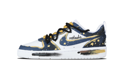 Эта пара, изготовленная на заказ, представляет собой оригинальную модель Nike Court Vision с оригинальными номерами BQ5448-100, DH2987-101 и HM9862-002. Кроссовки выполнены преимущественно в синих и черных тонах в простой и универсальной цветовой гамме, дополненной граффити для более стильного образа.