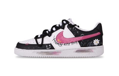 Эти кроссовки, изготовленные на заказ, основаны на мужской модели Nike Court Vision 1 (артикул DH2987-101). Преимущественно розово-черная расцветка кроссовок отличается простотой и универсальностью, дополненной граффити.