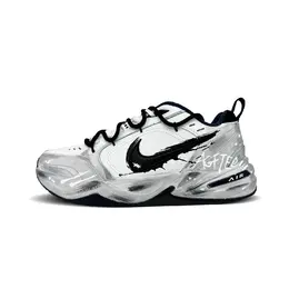 Эта кастомизированная версия кроссовок основана на оригинальных мужских кроссовках Nike Air Monarch 4 White Navy Dad, артикул 415445-102. Модель выполнена в классической черно-серой цветовой гамме, а ее верх украшен деконструкцией в стиле уличного граффити. Она модная и универсальная, с множеством деталей.
