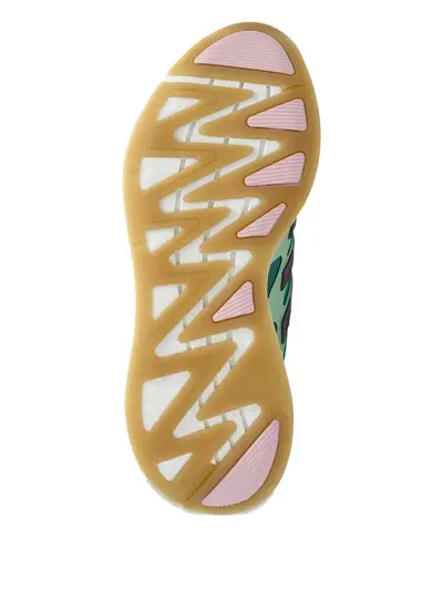Зеленая сетчатая панель, шнуровка, резиновая подошва, розовые детали, мягкий воротник.