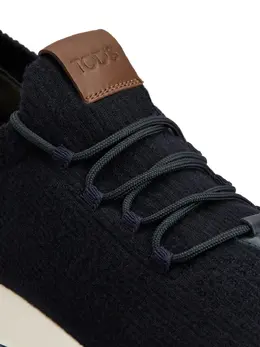 Верх из трикотажной кожи темно-синего цвета, пятка со шнуровкой, резиновая подошва.