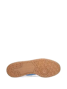 Белый кожаный верх, три синие полоски, низкий силуэт, резиновая подошва, мягкий воротник