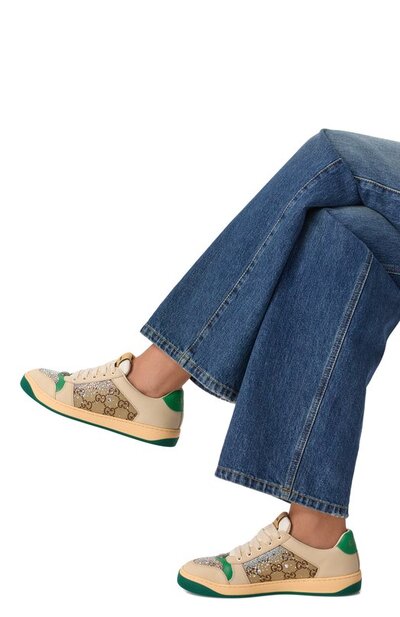 Кеды Screener из гладкой кожи дополнили текстильными вставками с узором GG Supreme, подчеркнув их кристаллами. Язычок декорировали брендированным патчем, а мыс – пластиной с эмблемой Double G.