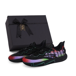 Эти кастомные кроссовки используют оригинальные баскетбольные кроссовки Anta KAI 2 Kyrie II Black Warrior Nitrogen Technology Professional Performance с амортизацией, износостойкостью и отскоком, с низкой пластиной из углеродного волокна в средней части стопы. Это мужская черная модель с артикулом 112531111S-3. Матовая тактическая черная основа придает кроссовкам бронированный корпус, разрушенный информационным штормом. Неоново-красный, электрический фиолетовый и флуоресцентный зеленый взрываются на боковой части кроссовка в стиле глитч-арта с зубчатыми пикселизированными трещинами по краям цветовых блоков, напоминающими жестоко взломанную систему обороны. Три очень насыщенных флуоресцентных цвета создают визуально поразительный эффект на черном фоне, как сигнальная лампа биологической опасности. Открытые узоры гидравлических труб и каркас из углеродного волокна перемежаются на верхней части, интерпретируя жестокую суть функциональной эстетики.