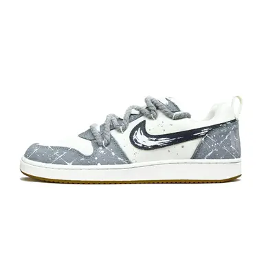Эти кастомные кроссовки основаны на оригинальной модели Nike Court Borough. Вдохновленные серо-белой чернильной живописью, они сочетают технику чернильных брызг с двойной шнуровкой.