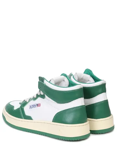 -Высокие кеды из кожи в белом и зеленом цветах от AUTRY. -Модель с закругленным мысом с перфорацией, толстой резиновой подошвой, функциональной шнуровкой, логотипами на боковинах и язычке, внутренней отделкой из натуральной кожи и текстиля.