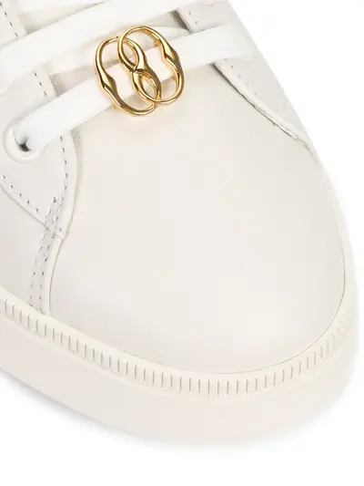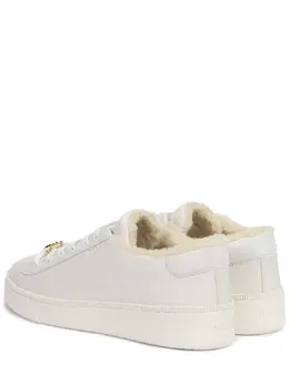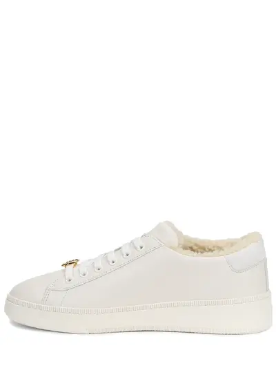 -Кремовые кеды из кожи от BALLY. -Модель с закругленным мысом, толстой резиновой подошвой, функциональной шнуровкой с золотистым логотипом, внутренней отделкой из натуральной овчины.
