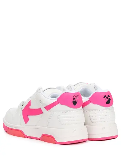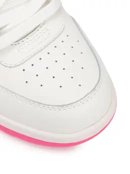 -Белые с розовыми акцентами кеды из кожи от OFF-WHITE. -Модель с закругленным перфорированным мысом, толстой резиновой подошвой, функциональной шнуровкой, логотипами на боковых панелях и задниках, внутренней отделкой из текстиля.