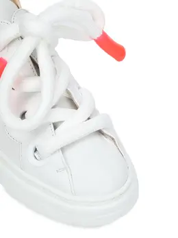 -Белые кеды из натуральной кожи от AGL. -Модель с закругленным мысом, крупными люверсами в тон, функциональной шнуровкой с акцентными деталями, литой резиновой подошвой с протектором и логотипами на пятках, внутренней отделкой из натуральной кожи.