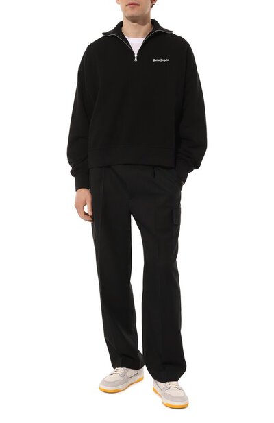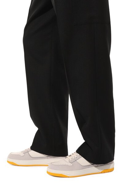 Светло-серые кеды Sneak-Air выполнили из гладкой мягкой кожи и бархатистого нубука. Модель изготовили так, чтобы она получилась легкой, но при этом могла плотно облегать ногу. Мыс и боковые стороны подчеркнули перфорированным узором. Принадлежность обуви марке, основанной супругами Сантони, обозначили золотистым логотипом, который дублирует надпись на широкой подошве сзади.