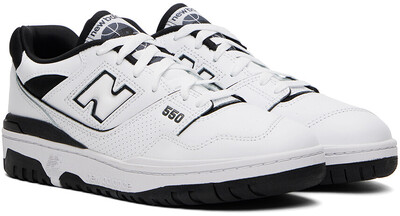 Бело-черные кроссовки BB550. Низкие кроссовки из зернистой кожи и сетки в белом и черном цветах. Перфорированная отделка по всей поверхности Шнуровка Нашивка с логотипом на мягком язычке Мягкий воротник Вставки с логотипом по бокам Тисненый логотип на заднике Сетчатая подкладка Текстурированная резиновая межподошва с тиснением логотипа Резиновая подошва с рифлением Цвет поставщика: Белый/Черный Верх: кожа, текстиль. Подошва: резина. Сделано во Вьетнаме. 241402F128160