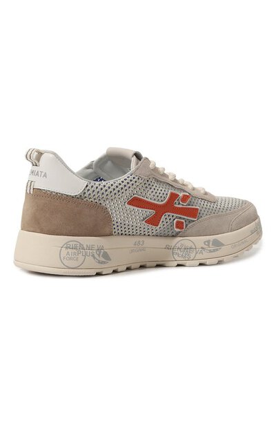 Бежевые кроссовки Nous сшиты из комбинации прочной нейлоновой сетки и фактурной замши. Верх отлично пропускает воздух внутрь обуви, а гибкая широкая подошва с узнаваемыми печатями и штампами слегка пружинит при ходьбе. Модель украшена по бокам кожаными аппликациями-иероглифами, говорящими о принадлежности бренду.
