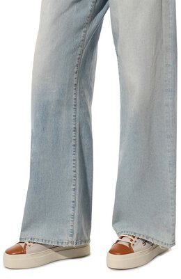 Кремовые кеды, вдохновленные теннисной обувью, выполнили из плотного канваса с отделкой из гладкой, тонко выделанной кожи. Модель с золотистыми люверсами украсили логотипом марки, основанной супругами Сантони. Пару установили на широкую подошву, отвечающую за комфорт каждого шага.