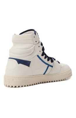 Для пошива белых высоких кедов Off Court 3.0 со сложносочиненной системой шнуровки использовали гладкую матовую кожу. Цветовые акценты модели добавили синими вставкой из фактурной замши на заднике и узким кантом по бокам. Пару с перфорацией и фирменной пломбой установили на широкую подошву с рельефным тиснением и глубоким противоскользящим протектором.