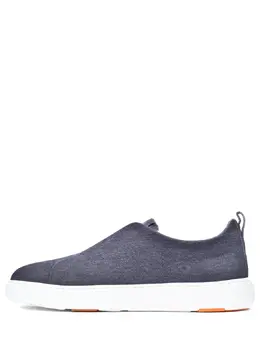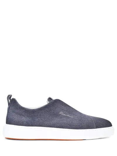 -Синие кеды из кожи с отделкой под деним от SANTONI. -Модель с закругленным мысом, толстой резиновой подошвой, логотипами бренда на боковых панелях, петлями на задниках, внутренней отделкой из натуральной кожи.