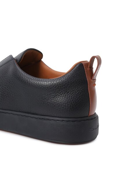 Черные кеды без шнуровки сшили из крупнозернистой тщательно выделанной кожи, устойчивой к появлению потертостей и царапин. Модель украсили золотистым логотипом марки, основанной супругами Сантони, который повторили в виде тиснения на язычке. Декор пары на гибкой почти нескользящей подошве завершили вставкой с миниатюрным стежком на заднике, окрашенной в фирменной технике velatura.