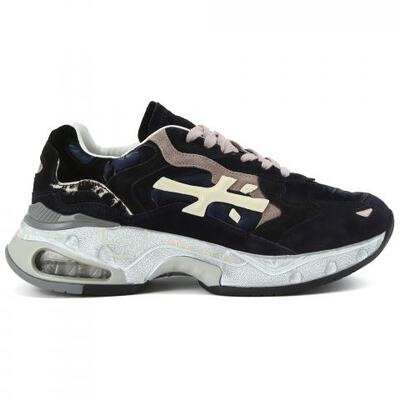 Кроссовки в тёмно-синем цвете от Premiata. Новая модель из осенней коллекции бренда представлена в тёмно-синем цвете с акцентными деталями. Пара на высокой подошве особенно актуальна для влажной погоды, а благодаря базовому цвету и необычному дизайну она прекрасно подойдёт для городских образов на каждый день. Верх из натуральной замши и плотной ткани, фирменный логотип сбоку и высокая подошва с прозрачной вставкой на пятке - идеальные городские кроссовки от Premiata.