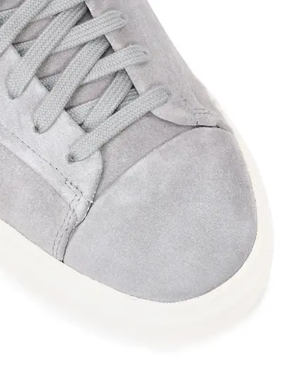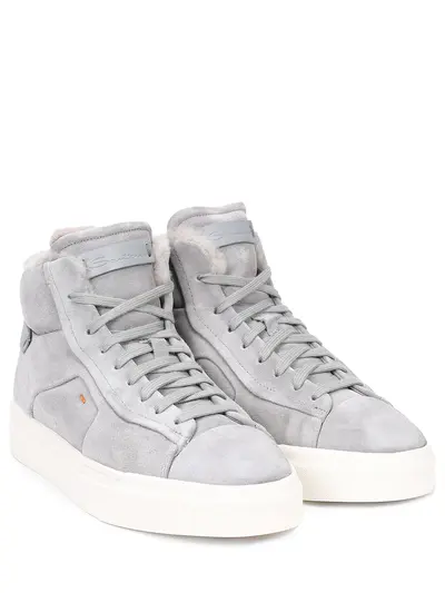 -Серые высокие кеды из бархатистой замши от SANTONI. -Модель с закругленным отрезным мысом, толстой резиновой подошвой, функциональной шнуровкой, застежкой на молнию сбоку, внутренней отделкой из тёплой овчины.