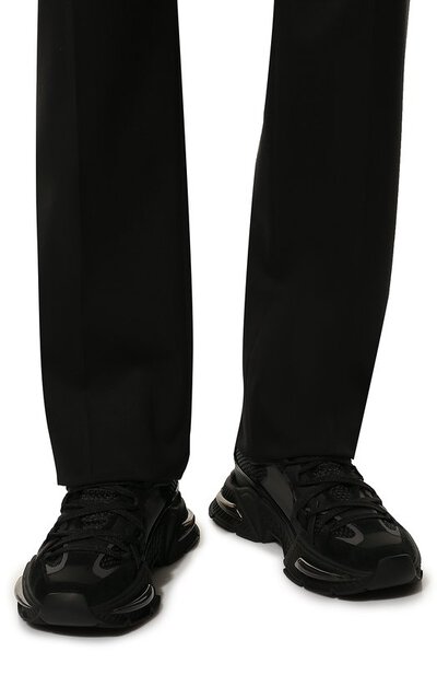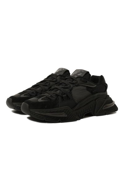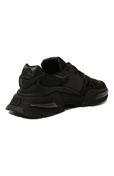 Для пошива черных кроссовок Airmaster Доменико Дольче и Стефано Габбана выбрали легкую, но прочную сетку, хорошо пропускающую воздух. Пару на скульптурной подошве с рифленым узором по бокам укрепили фигурными вставками из фактурной замши и гладкой кожи. Объемную накладку на заднике декорировали DG-монограммой, вышитой нитями в тон.
