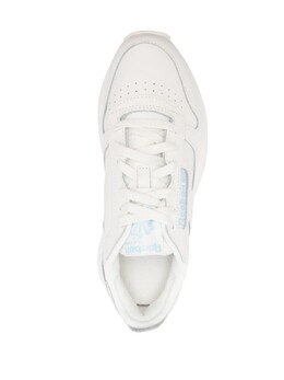 Белый, голубой, телячья кожа, перфорация, нашивка с логотипом на язычке, закругленный носок, шнуровка спереди и рифленая резиновая подошва.